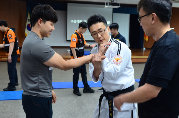 영등포소방서는 구급대원 폭행피해를 방지를 위해 17일 오전 4층 강당에서 구급대원 30명을 대상으로 자기방어술 특별 교육 훈련을 실시했다. 사진은 영등포구 합기도협회 사무장이 구급대원들에게 자기방어술에 대해 설명하고 있는 모습. (사진제공=영등포소방서)