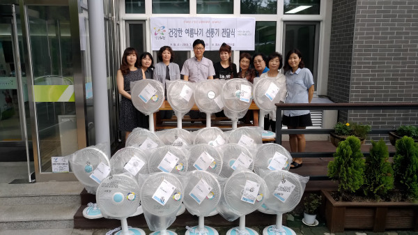 최근 서울 노원구 상계9동주민복지협의회는 무더위 저소득 취약계층 가구의 건강을 보호한다는 취지에서 ‘건강한 여름나기 선풍기’를 전달했다. 사진은 선풍기 전달식에 참석한 동 및 협의회 관계자들이 기념촬영을 하는 모습. (사진제공=노원구청)