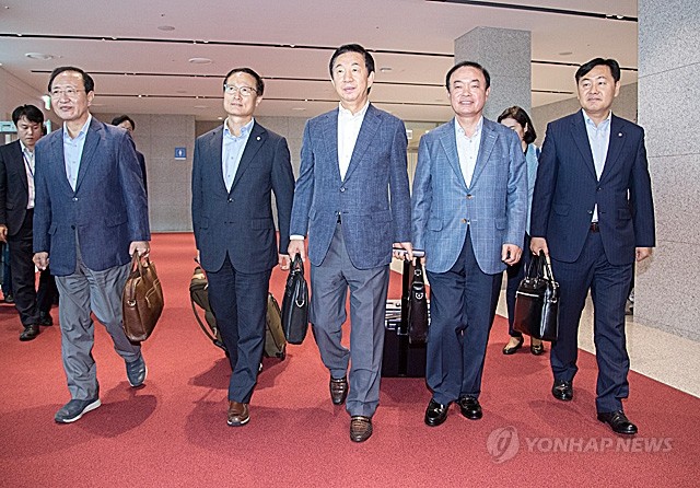 여야 5당 원내대표가 18일 오전 인천공항 귀빈실에서 미국 출국에 앞서 기자간담회를 마친 뒤 출국장으로 향하고 있다. 4박6일 일정으로 미국을 방문하는 이들은 미국 의회와 행정부, 재계, 싱크탱크 관계자를 만나 한반도 비핵화와 항구적 평화체제 구축, 미국의 자동차 고율관세 부과 등 통상 현안에 관한 우리 측 입장을 전달할 계획이다. 왼쪽부터 정의당 노회찬, 더불어민주당 홍영표, 자유한국당 김성태, 민주평화당 장병완, 바른미래당 김관영 원내대표.