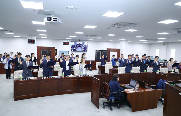 최근 서울 송파구의회가 4층 본회의장에서 개원식을 열고 법령을 준수하고 구민의 복리증진과 지역사회 발전을 위해 의원직을 성실하게 수행할 것을 구민 앞에 엄숙히 선서했다. 사진은 개원식에 참여한 26명의 의원들이 선서를 하고 있는 모습. (사진제공=송파구의회)