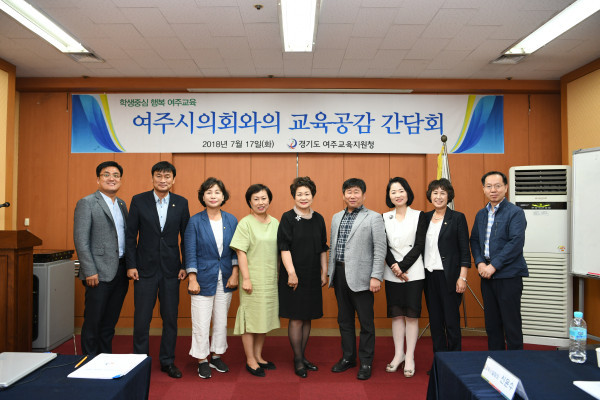 경기 여주교육지원청이 지난 17일 일성콘도에서 서길원 교육장과 교육청 직원을 비롯해 여주시의회 김영자 부의장 등 의원들이 참석한 가운데 ‘시의회와의 교육공감 간담회’를 개최했다. 사진은 간담회에 참석한 관계자들이 기념촬영을 하는 모습. (사진제공=여주교육지원청)