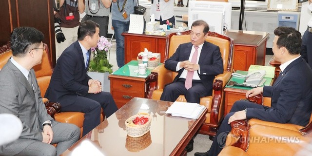 자유한국당 김병준 혁신비대위원장(가운데)이 19일 오전 국회에서 인사차 방문한 한병도 청와대 정무수석(왼쪽), 송인배 정무비서관과 만나 대화를 하고 있다.