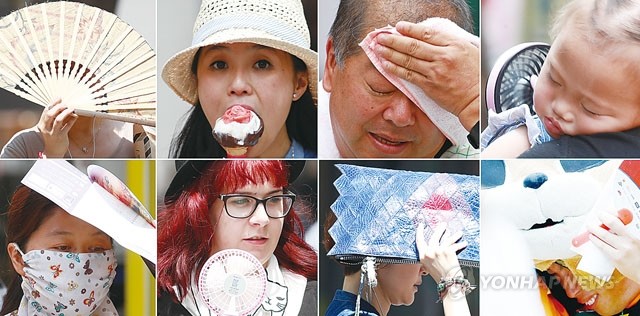 연일 계속되는 폭염 속에서 24일 서울 명동 거리에서 외국인 관광객, 시민, 어린이, 홍보도우미가 부채, 휴대용 선풍기, 아이스크림, 마스크, 가방 등으로 더위를 식히고 햇볕을 피하며 거리를 오가고 있다.