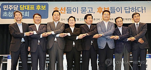 24일 오후 국회 헌정기념관에서 더불어민주당 초선 국회의원 주최로 열린 당대표 후보 초청토론회에서 후보들이 손을 맞잡고 포즈를 취하고 있다. 왼쪽부터 이인영, 최재성, 김두관, 박범계, 김진표, 송영길, 이해찬, 이종걸 후보.