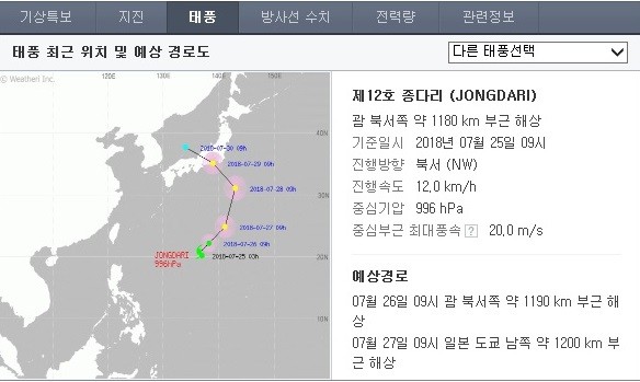 25일 기상청은 올해 12번째 태풍인 종다리가 괌 부근에서 발생해 이동하고 있다고 밝혔다. 강도는 약이며 크기는 소형이다.