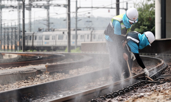 | ▲ 25일 오후 근로자들이 땡볕에 달궈진 철로를 스프링클러로 식히며 점검하고 있다.(사진제공=연합뉴스) | ||