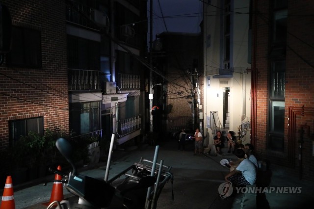 전국적으로 폭염경보가 발효 중인 25일 새벽 정전 사고가 발생한 서울 중구 동호로 11자길 일부 지역에서 인근 주민들이 복구공사가 진행되는 동안 거리에서 더위를 식히고 있다.