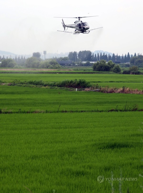 25일 오전 강서구 '서울 경복궁 쌀' 재배 지역에서 서울시가 친환경농약으로 항공방제를 하고 있다.