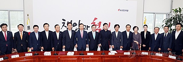 김병준 위원장, 김성태 원내대표, 함진규 정책위의장 등 자유한국당 혁신비상대책위원들이 25일 국회에서 열리는 혁신비상대책위원회 첫 회의에 앞서 손을 잡고 사진촬영을 하고 있다.