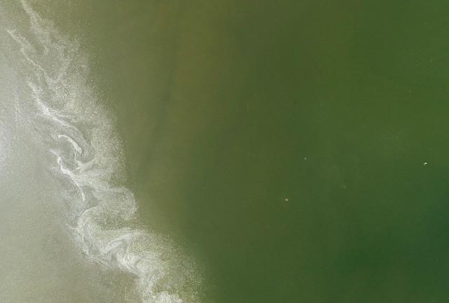 폭염이 이어진 26일 광주 남구 영산강 승촌보 수문 강물에 녹조가 발생하고 있다.