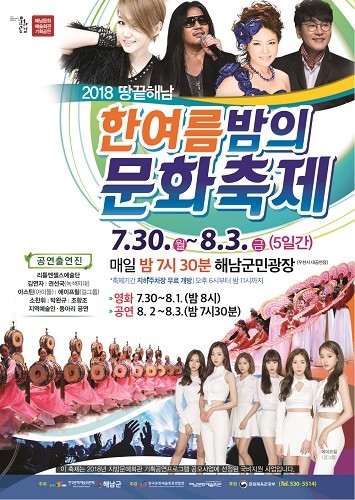 전남 해남군은 오는 30일부터 8월 3일까지 5일 동안 군민광장에서 뜨거운 여름밤의 더위를 식혀줄‘2018 땅끝 한여름밤의 문화축제’를 개최한다.