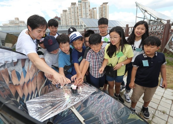 30일 서울 금천구청에서 열린 2018 청소년 과학경제캠프에서 학생들이 태양열로 간식만들기 체험을 하고 있다.
