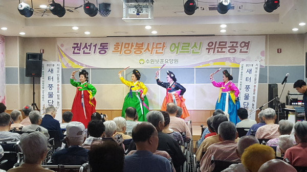 경기 수원시 권선구 권선1동은 새터풍물단 주관으로 지난 27일 수원 보훈요양원에서 120여명 노인을 초대해 즐거운 공연 봉사활동을 진행했다. 사진은 새터풍물단이 한국무용을 선보이는 모습. (사진제공=권선구청)