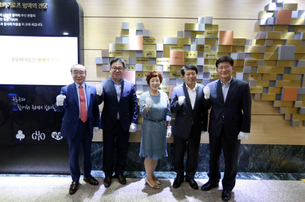 서울 구로구가 지난 27일 구청 르네상스홀에서 구로히어로즈 가입식 및 명예의 전당 헌액식을 개최했다. 사진은 구로히어로즈헌액식에 참가한 (우측부터)정동희 한국산업기술시험원원장, 이성 구청장, 하오자 삼성파워일렉트릭 대표, 이삼행 애경유화 본부장이 기념촬영을 하고 있는 모습. (사진제공=구로구청)
