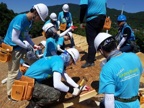 한국해비타트 한국번개건축봉사 대축제에 참가한 봉사원들이 31일 충남 천안시 목천읍 서리에서 폭염도 아랑곳하지 않고 봉사활동에 구슬땀을 흘리고 있다.