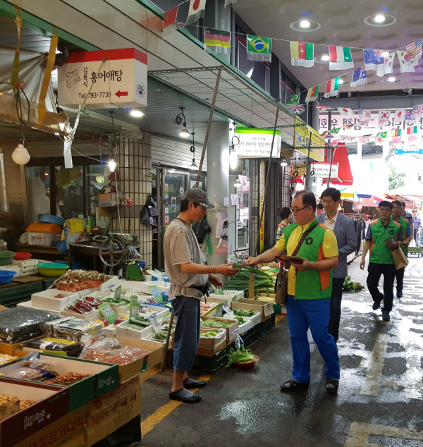 지난 30일 경기 하남시 지역자율방재단이 연일 계속되는 폭염에 따른 피해를 최소화하고자 신장시장 및 인근 지역에서 시장상인 및 지역주민 등을 대상으로 '폭염 피해예방 캠페인'을 실시하며 홍보물을 나눠주고 있다. (사진제공=하남시청)