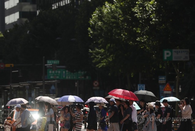 폭염이 이어진 31일 서울 광화문네거리에 시민들이 우산을 쓴 채 걸어가고 있다.