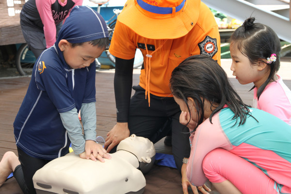 관악소방서는 본격적인 휴가철과 방학기간을 맞아 물놀이 인명피해 및 안전사고를 예방하기 위해 지난 31일 오후 도림천 물놀이장에서 물놀이 안전교육을 실시했다. 사진은 참여자들이 심폐소생술 실습을 하고 있는 모습. (사진제공=관악소방서)