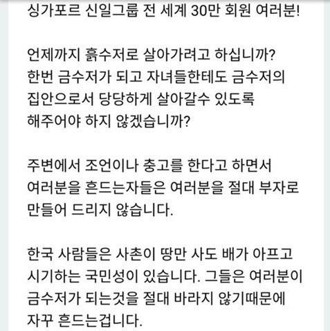 또한 '싱가포르 신일그룹 한국내 업무를 담당할 대리인과 법인, 변호인 선임' 게시글에서는 "언제까지 흙수저로 살아가려고 하십니까? 한번 금수저가 되고 자녀들한테도 금수저의 집안으로서 당당하게 살아갈수 있도록 해주어야 하지 않겠습니까?"등의 표현을 사용했다.