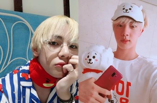 공개된 사진 속 진은 자신이 디자인 한 ‘BT21’의 캐릭터 알제이 모양의 헤어 밴드와 해당 캐릭터가 프린팅 된 티셔츠, 알제이 인형까지 장착한 모습으로 역대급 귀여움을 자랑했다. 특히 두 장의 사진에서 진은 시크함과 달달함을 넘나드는 극과 극 표정으로 시선을 사로잡았다.