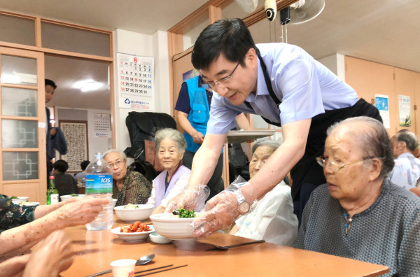 이동진 도봉구청장은 7일 해동나누미 봉사단 주최로 창1동 주공아파트3단지 경로당에서 열린 ‘사랑의 삼계탕 나눔봉사’에 참석해 지역노인 100여명에게 삼계탕을 대접했다. 사진은 삼계탕을 배식하고 있는 이 구청장의 모습. (사진제공=도봉구청)