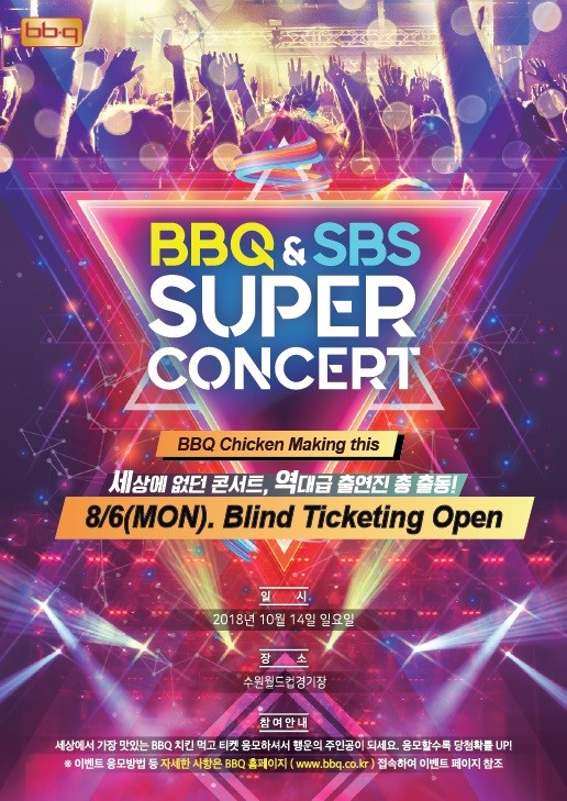 이번 BBQ-SBS 슈퍼콘서트는 약 4만명 수용 가능한 수원월드컵경기장에서 열리며, 주제는 ‘CSR’로 사회적 취약계층에 대한 지원 등 다양한 사회공헌 프로그램이 펼쳐진다.