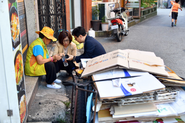 8일 은수미 경기 성남시장이 성남동에서 폐지를 줍는 노인들의 애로사항을 청취했다. 사진은 앉아서 쉬고 있는 한 노인에게 전달하기 위해 일회용 생수병을 열고 있는 은 시장(가운데)의 모습. (사진제공=성남시청)