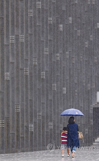 한때 소나기가 내린 9일 서울 서대문구 이화여대에서 한 모자가 우산을 쓰고 캠퍼스를 지나고 있다.