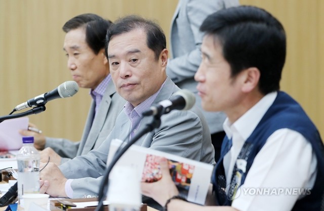 자유한국당 김병준 비상대책위원장(가운데)이 9일 오전 경북 경주 화백컨벤션센터에서 열린 ‘탈원전 정책 재고를 위한 국민경청회’에 참석해 김병기 한수원노조위원장 발언을 듣고 있다.