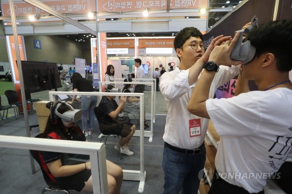 9일 경기도 고양시 킨텍스에서 열린 2018 대한민국과학창의축전에서 관람객들이 가상현실(VR) 장비로 면접을 체험하고 있다.