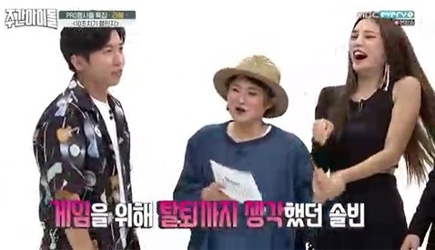 그러자 솔빈은 잔뜩 긴장한 모습을 보였다. 자신이 게임 구멍이었기 때문. 급기야 솔빈은 멤버들에게 "나 빠질까?"라고 묻기도. 하지만 유정, 소연, 지엔, 해인, 솔빈은 '한글사랑 나라사랑'을 성공해냈다.