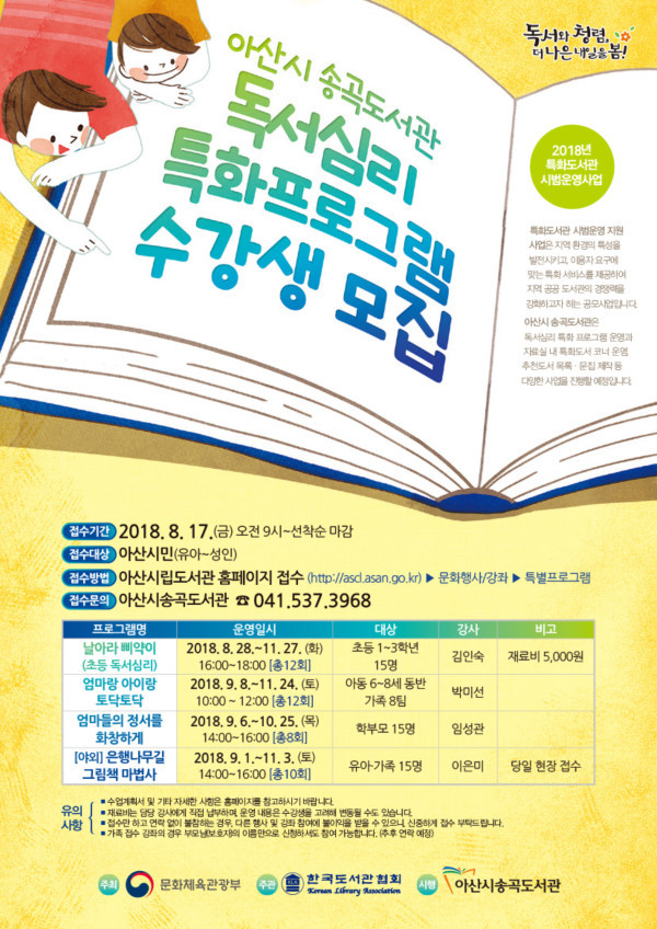 [아산=박명수 기자] 충남 아산시 송곡도서관이 ‘특화도서관 시범운영사업’의 일환으로 다양한 독서문화 프로그램을 운영하기로 하고, 오는 17일 오전 9시부터 시립도서관 홈페이지를 통해 선착순 참가 접수를 받는다.