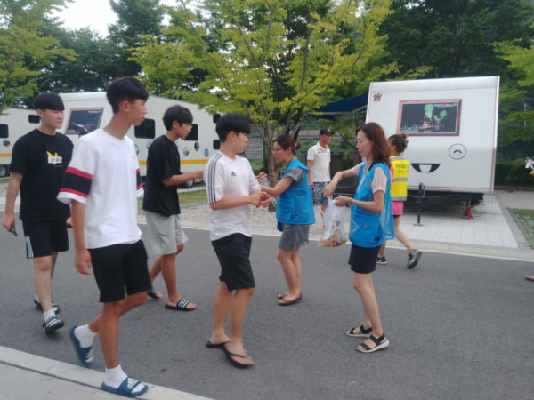 (재)경기 연천군 청소년육성재단 청소년 상담복지센터는 여성가족부의 여름철 피서지 청소년 유해환경 개선 추진사업에 발맞춰 지난 8일 ‘청소년 선도·보호활동’을 진행했다. 사진은 활동에 참여한 자원봉사자들이 청소년들에게 홍보물을 나눠주는 모습.(사진제공=연천군청)