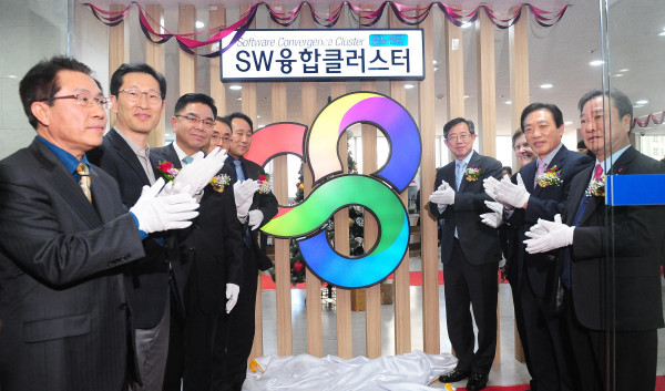 | ▲ 2014년 송도 애니오션빌딩 12층 행사장에서 배국환 인천시정무부시장과 김상룡 인천정보산업진흥원장, 미래창조과학부 차관 등이 참석한 가운데 열린 'SW융합 클러스터 송도센터' 개소식 모습. (사진제공=인천시청) | ||