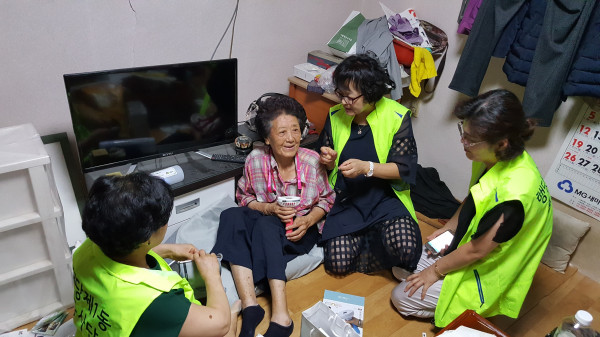 최근 서울 성동구 행당1동은 폭염 사각지대에 있는 폐지수집 노인들이 시원한 여름을 보낼 수 있도록 하고자 폐지수집 노인 8가구에 손선풍기를 전달했다. 사진은 동 관계자들로부터 선풍기를 선물 받은 노인이 선풍기를 이용하는 모습. (사진제공=성동구청)