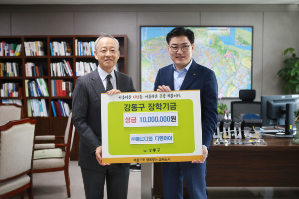 최근 이정훈 강동구청장이 구청장집무실에서 (주)메리디안 디엔아이로부터 경제적 사정이 어렵거나 성적이 우수한 지역내 고등학생들을 위해 사용해달라며 장학금 1000만원을 전달받았다. 사진은 이 구청장(오른쪽)이 장학금을 전달받은 후 기념촬영을 하고 있는 모습. (사진제공=강동구청)