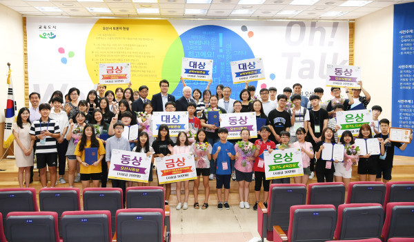 경기 오산시는 지난 8~11일 한신대학와 함께 개최한 ‘제4회 오산시 전국 학생토론대회’를 학생들의 뜨거운 호응 속에 마무리했다. 사진은 토론대회에 참여한 학생들이 시상식 후 기념촬영을 하는 모습. (사진제공=오산시청)