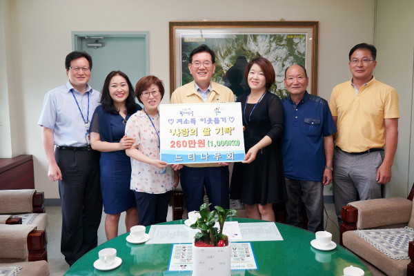 서울 동대문구청 직원모임인 ‘느티나무회’가 최근 유덕열 구청장에게 어려운 이웃을 돕기 위한 1000kg(100포·260만원 상당)의 ‘사랑의 쌀’을 전달했다. 기부된 쌀은 구 보훈회관에 기탁돼 지역내 보훈단체 국가유공자 회원들의 급식물품으로 사용될 예정이다. 사진은 기념촬영을 하고 있는 느티나무회와 유 구청장의 모습. (사진제공=동대문구청)