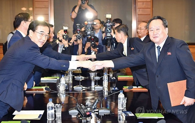 13일 판문점 북측 통일각에서 열린 남북고위급회담에서 우리측 수석대표 조명균 통일부 장관(왼쪽)과 북측 수석대표 리선권 조국평화통일위원회 위원장이 회담을 마치고 악수하고 있다.