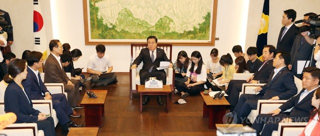 13일 오전 국회 의장접견실에서 열린 국회의장, 여야 원내대표 회동에서 참석자들이 얘기를 하고 있다.