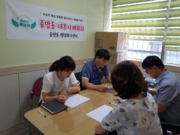경기 동두천시 중앙동 행정복지센터 맞춤형복지팀은 최근 복지상담실에서 지역내 저소득 취약계층의 다양하고 복합적인 문제해결을 위한 8월 내부사례회의를 개최했다. 사진은 참여자들이 회의를 진행하는 모습. (사진제공=동두천시청)