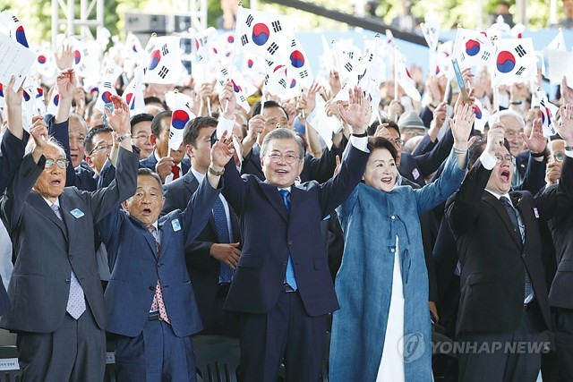 문재인 대통령이 15일 오전 서울 용산구 국립중앙박물관 열린마당에서 열린 제73주년 광복절 및 정부수립 70주년 경축식에서 참석자들과 함께 만세삼창을 하고 있다.