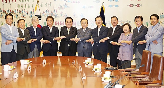 16일 오전 국회 접견실에서 열린 문희상 국회의장과 상임위 위원장 회동에서 참석자들이 협치를 다짐하며 손을 맞잡고 있다.
