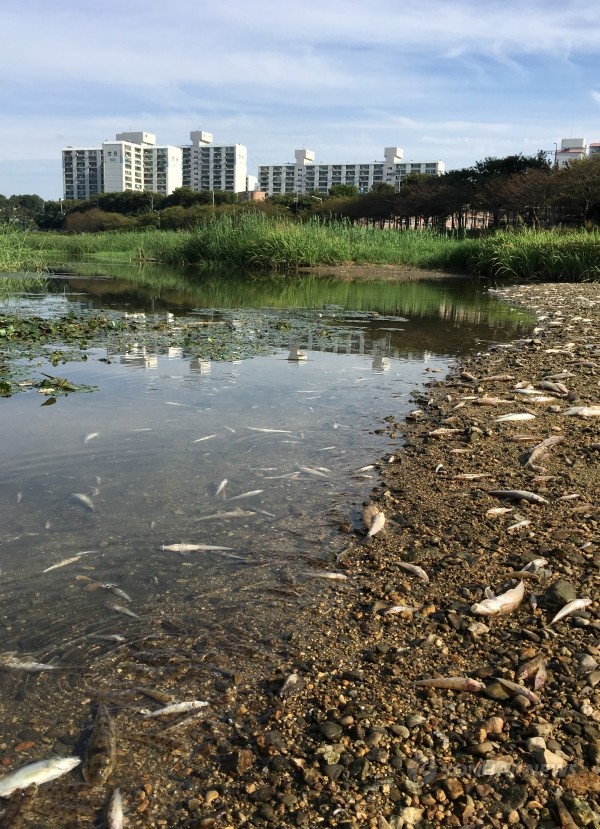 16일 오전 전북 전주시 완산구 삼천변에 물고기 수천마리가 죽어 있다. 전북환경운동연합은 폭염으로 수온이 상승한 상태에서 전날에 내린 비로 주변의 비점오염원들이 삼천에 대거 유입돼 물고기가 폐사했다고 밝혔다.