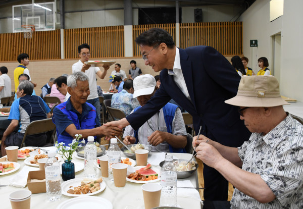 유난히 더운 올 여름, 삼복(三伏) 가운데 마지막 복날인 '말복'을 맞아 김선갑 서울 광진구청장이 14일 광장종합사회복지관에서 열린 ‘말복맞이 사랑의 복 삼계탕 행사’에 참석해 노인들을 격려했다. 사진은 김 구청장이 노인들과 인사를 나누는 모습. (사진제공=광진구청)