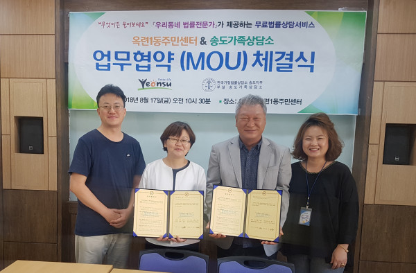 인천 연수구 옥련1동과 한국가정법률상담소 송도지부 부설 송도가족상담소는 지난 17일 지역내 사회적약자와 취약계층을 위해 월 1회 '무료 법률상담'을 실시하기로 했다. 사진은 무료 법률상담 업무협약을 체결한 후 관계자들이 기념촬영을 하는 모습. (사진제공=연수구청)