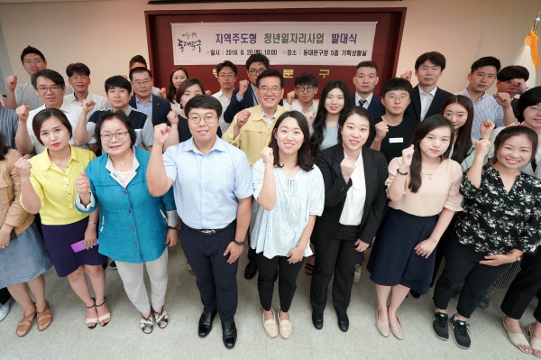 20일 동대문구청 기획상황실에서 동대문지역 주도형 청년일자리사업에 참여하는 청년 및 기업 관계자들이 발대식을 갖고 유덕열 구청장(가운데)과 함께 파이팅을 외치고 있다. (사진제공=동대문구청)