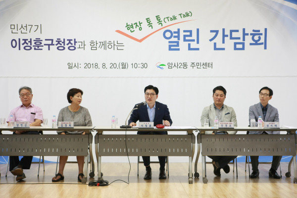 20일 이정훈 강동구청장(가운데)이 암사2동 주민센터 4층 강당에서 암사2동 직능단체대표와 주민들 25명과 함께 하는 ‘현장톡톡(Talk Talk) 열린간담회’에 참석해 주민들과 소통하고 교감하는 시간을 보냈다. 사진은 간담회 진행 모습. (사진제공=강동구청)