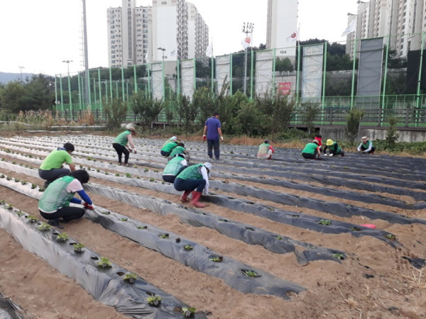 경기 광주시 광남동 새마을협의회는 20일 장지동에 위치한 1960㎡ 규모의 유휴지에서 배추 심기 행사를 개최했다. 사진은 배추 심기 행사에 참가한 회원들이 모종을 옮겨 심는 모습. (사진제공=광주시청)