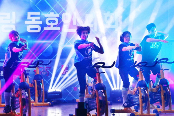 인천 미추홀구는 지난 18일 구청 대회의실에서 ‘제2회 전국 인도어사이클링 동호인 대회’를 개최했다. 지난해에 이어 올해로 2회를 맞은 대회에는 개인전 9개팀, 페어전(2명) 6개팀, 단체전(3~12명) 28개팀 등 전국 43개팀 207명의 선수가 참가했다. 사진은 참여자들이 인도어사이클링 퍼포먼스를 선보이는 모습. (사진제공=미추홀구청)
